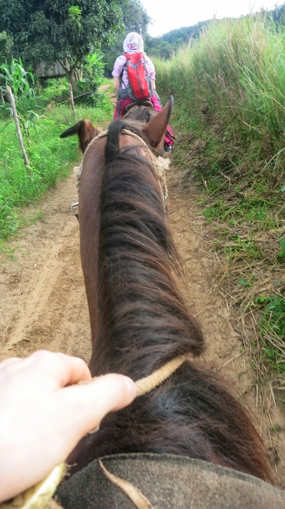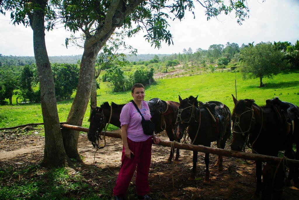Potem spotkanie z naszymi Niemkami i taksówka na konie. Każda z nas otrzymała konika (a kubańskie koniki są jakieś takie małe) i hajda. Koniki, jak powiedział nasz przewodnik, to takie półautomaty. Nie zgodzę się z nim, to są raczej takie automaty. Wiedza gdzie skręcić, gdzie się zatrzymać. Mój konik miał charakter lidera, wiec lubił iść z przodu i czasami nawet przechodził w lekki kłus. Z tylu przewodnik opowiadał Agnieszce o okolicach i życiu Kubańczyków.