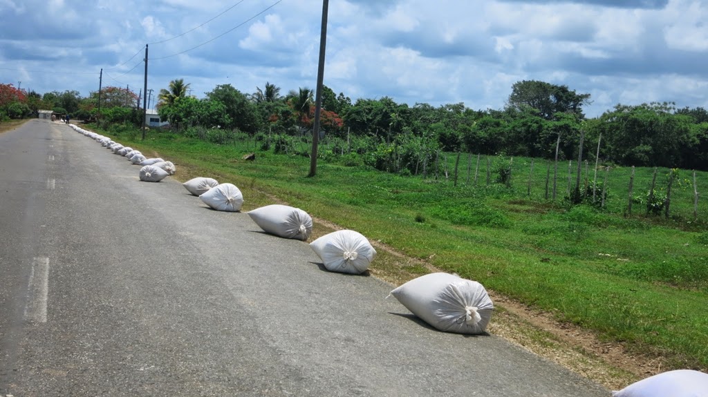 Jedyny plus tego taksówkarza, to to, ze pokazał nam jak na Kubie suszy się ryż. Po drodze zauważyliśmy coś wysypanego na drodze. Okazało się, że ten sposób suszy się ryż czyli najpierw robotnicy wysypują ryż na drogę. Taki pas może się ciągnąć przez kilka kilometrów. Potem czekają parę godzin, biorą miotły, zamiataj z drogi i wsypują już wysuszony ryż do worków. Co ciekawe, samochody starają się nie jeździć po tym ryżu, ale jeśli nie maja wyjścia, to nikomu to nie przeszkadza.