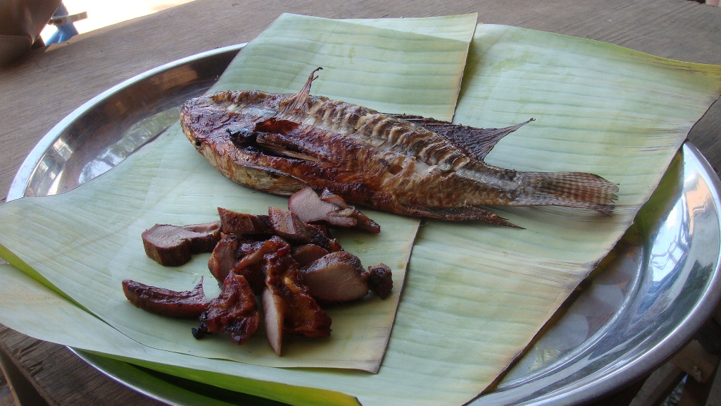 a czasami dawałyśmy sobie radę bez sztućców i bez pałeczek. Tu zostałyśmy poczęstowane ryżem z bananem pieczonym na grillu w liściach bananowca