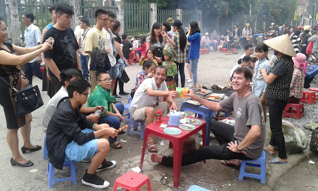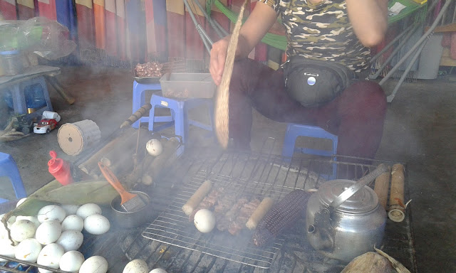 Spacerując po Sapa trafiłyśmy na targ, gdzie miejscowe kobiety oferowały różne pyszności z grilla. Wprawdzie nie były to karczki czy kiełbaski, ale równie smakowite rzeczy takie, jak jajeczka, ziemniaki, grzybki zawinięte w mięsko, kukurydza itp. My usiadłyśmy w miejscu, gdzie już siedziała grupa Wietnamczyków oraz jakiś turysta, jak później się okazało, z Australii. Towarzystwo było bardzo wesołe i nikomu nie przeszkadzało, że czasami nie rozumieliśmy co mówią ci drudzy 🙂 Najzabawniejsze było to, że jak tylko się dosiadłyśmy Australijczyk powiedział do nas: „jesteście z Polski, prawda?”. Zaskoczyło nas to. Dopiero na drugi dzień wpadłyśmy na pomysł, że mógł zauważyć na moim plecaku orzełka z napisem POLSKA. Cwaniaczek 😉
